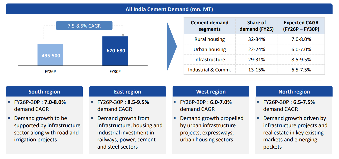 • To begin with, India’s cement demand is projected to grow from 495–500 mn MT in FY26 to 670–680 mn MT in FY30, implying a 7.5–8.5% CAGR.