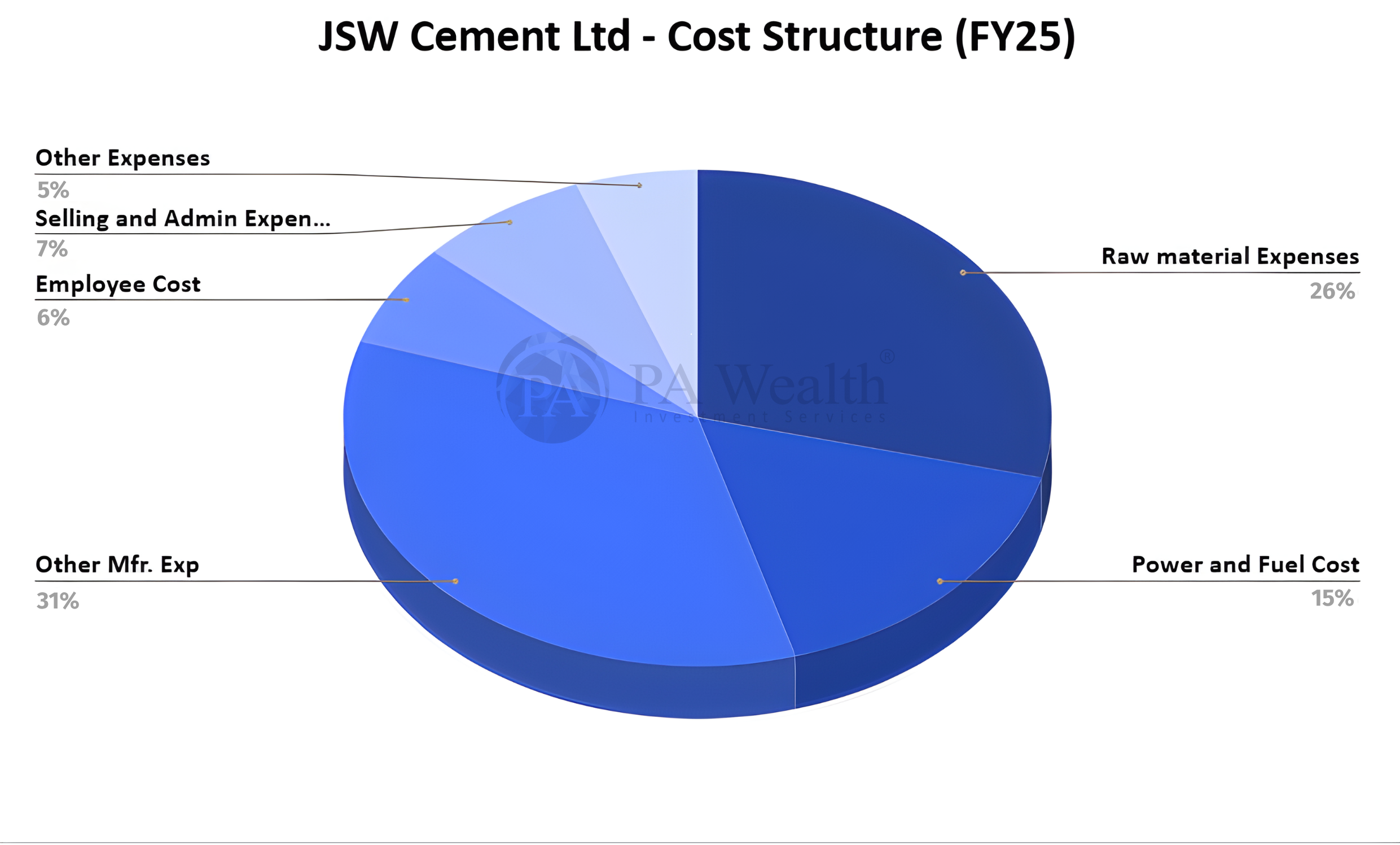As India’s largest producer of Ground Granulated Blast Furnace Slag (GGBS), JSW Cement commands an 84% market share in FY25. Its commitment to sustainability is evident, with a clinker-to-cement ratio of 51% and CO₂ emissions of 258 kg/tonne, both among the lowest in the industry.