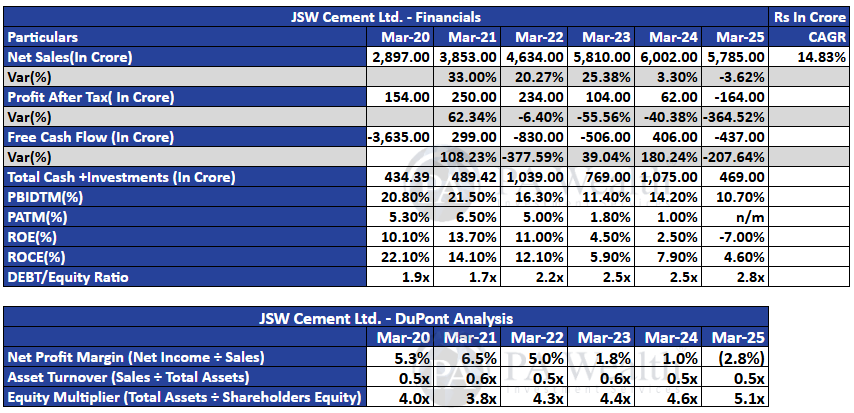 • To start with, JSW Cement’s sales grew at a strong 14.8% CAGR (FY20–FY25), but profitability weakened, turning into a net loss of ₹164 crore in FY25.