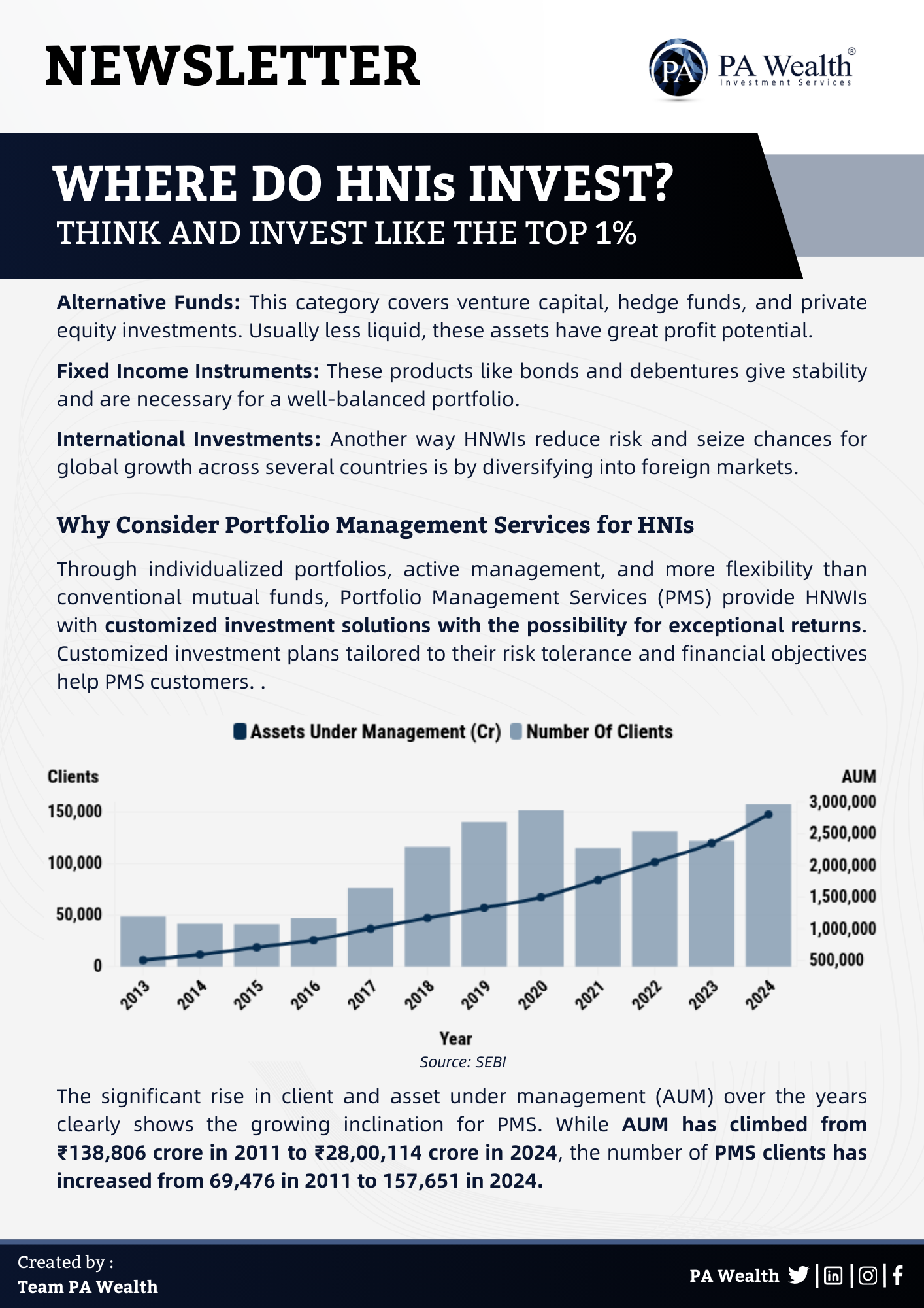 In recent years, the global High-Net-Worth Individual (HNI) population has grown significantly. According to the World Wealth Report 2024, HNIs wealth and population increased by 4.7% and 5.1% in 2023. This growth has been driven by strong market performance and better economic conditions, prompting HNIs to invest in alternative investments like PMS and AIFs for higher returns.